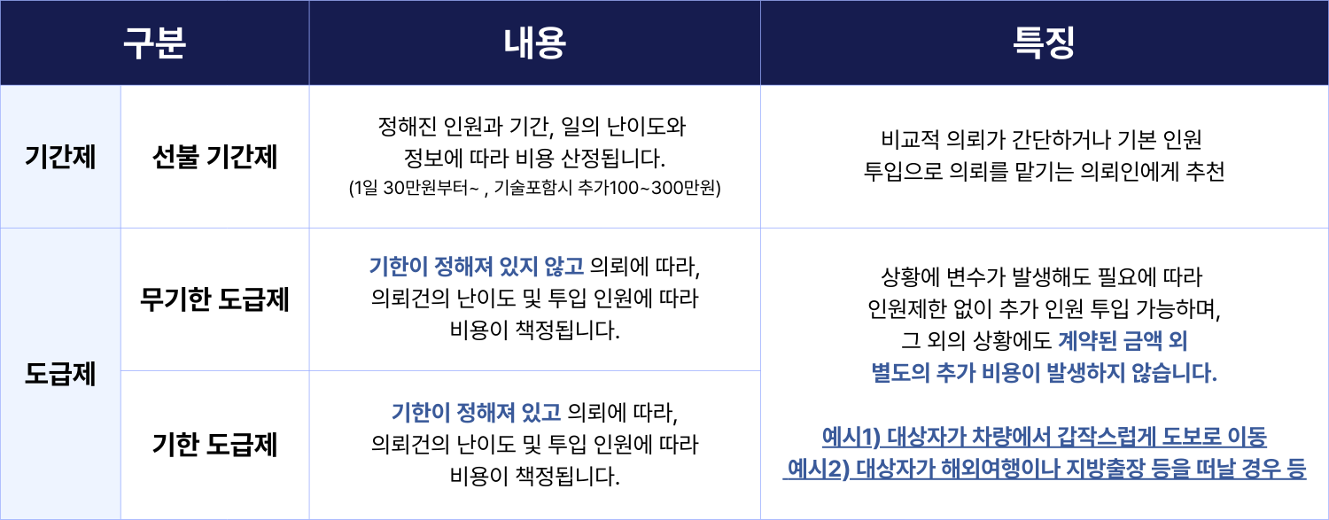 공존 탐정사무소는 기간제, 도급제 방식으로 진행합니다. 정확한 탐정비용은 상담을 통해 상황을 확인한 후 안내해드립니다.